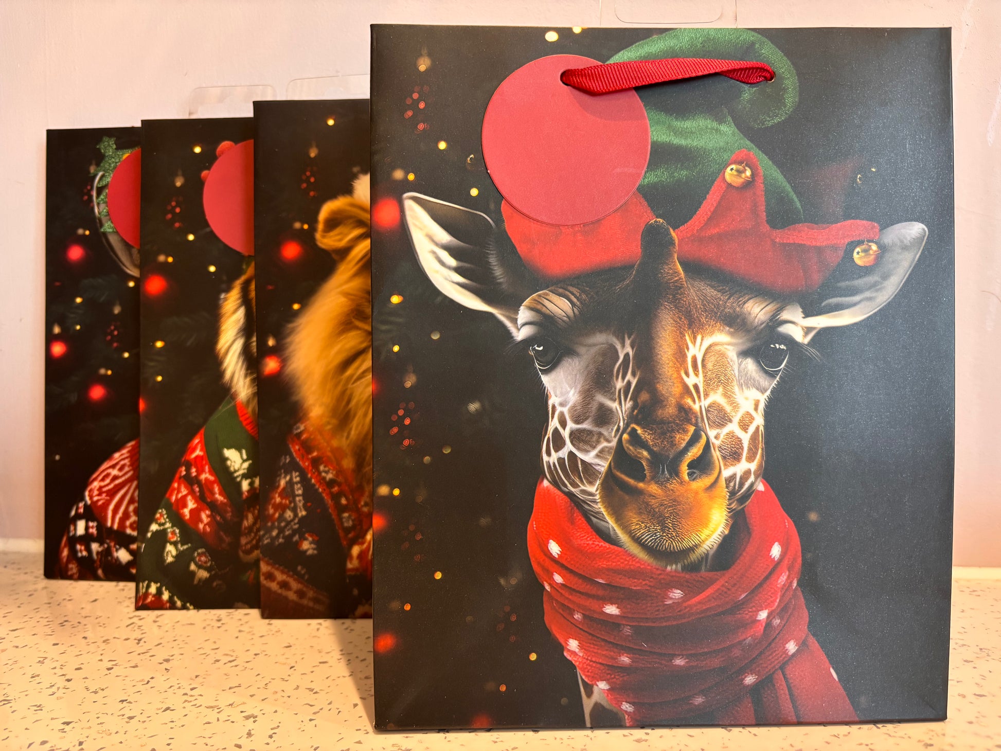 Bring a festive smile with this seasonal gift bag featuring a giraffe in its Christmas scarf and elf hat illustration. Red ribbon carry cords with a tag attached to write that special personalised message on.