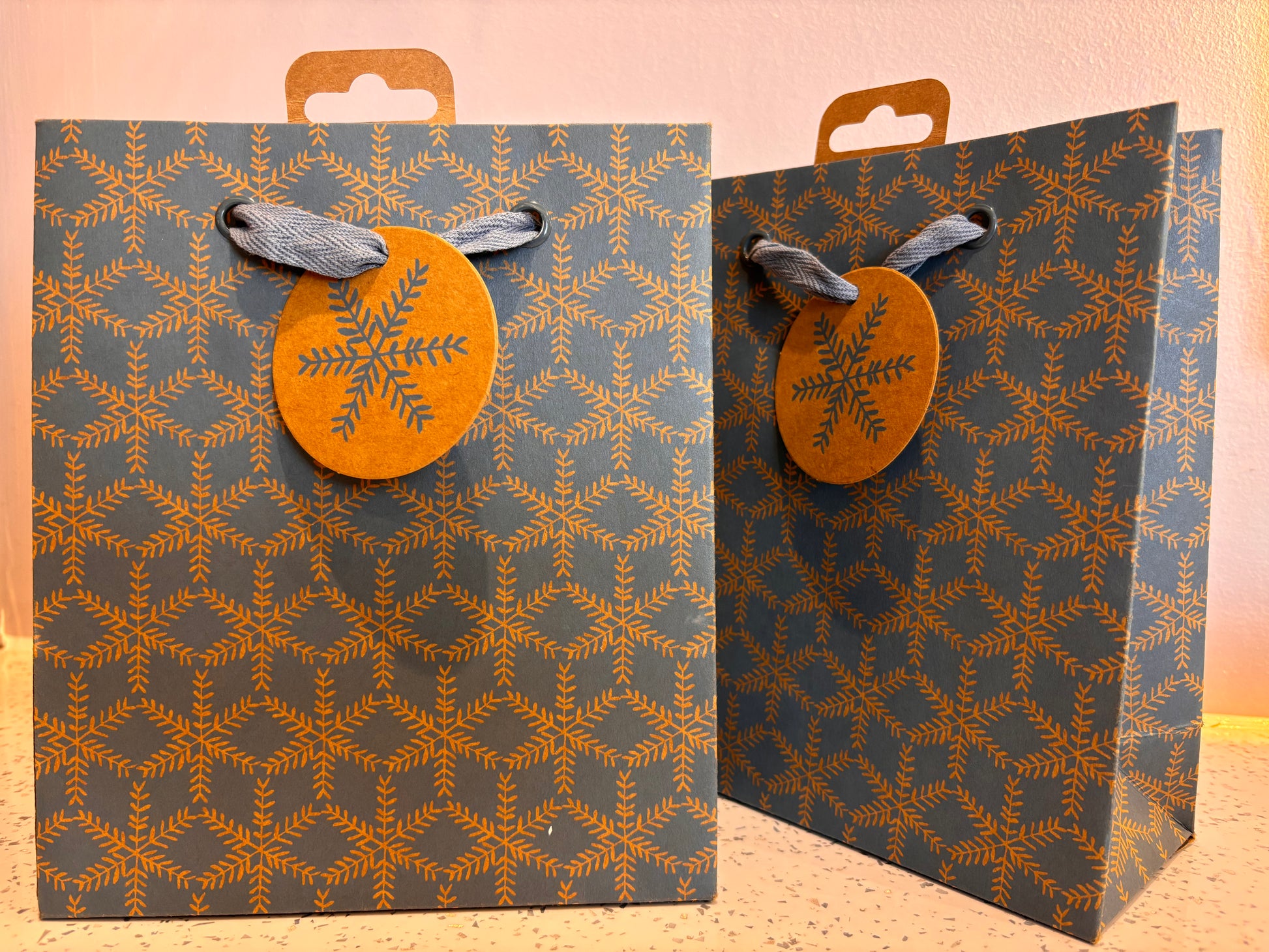 Snowflake Christmas gift bag made from 100% recycled paper. Blue ribbon carry cords with a tag attached to write that special personalised message on.