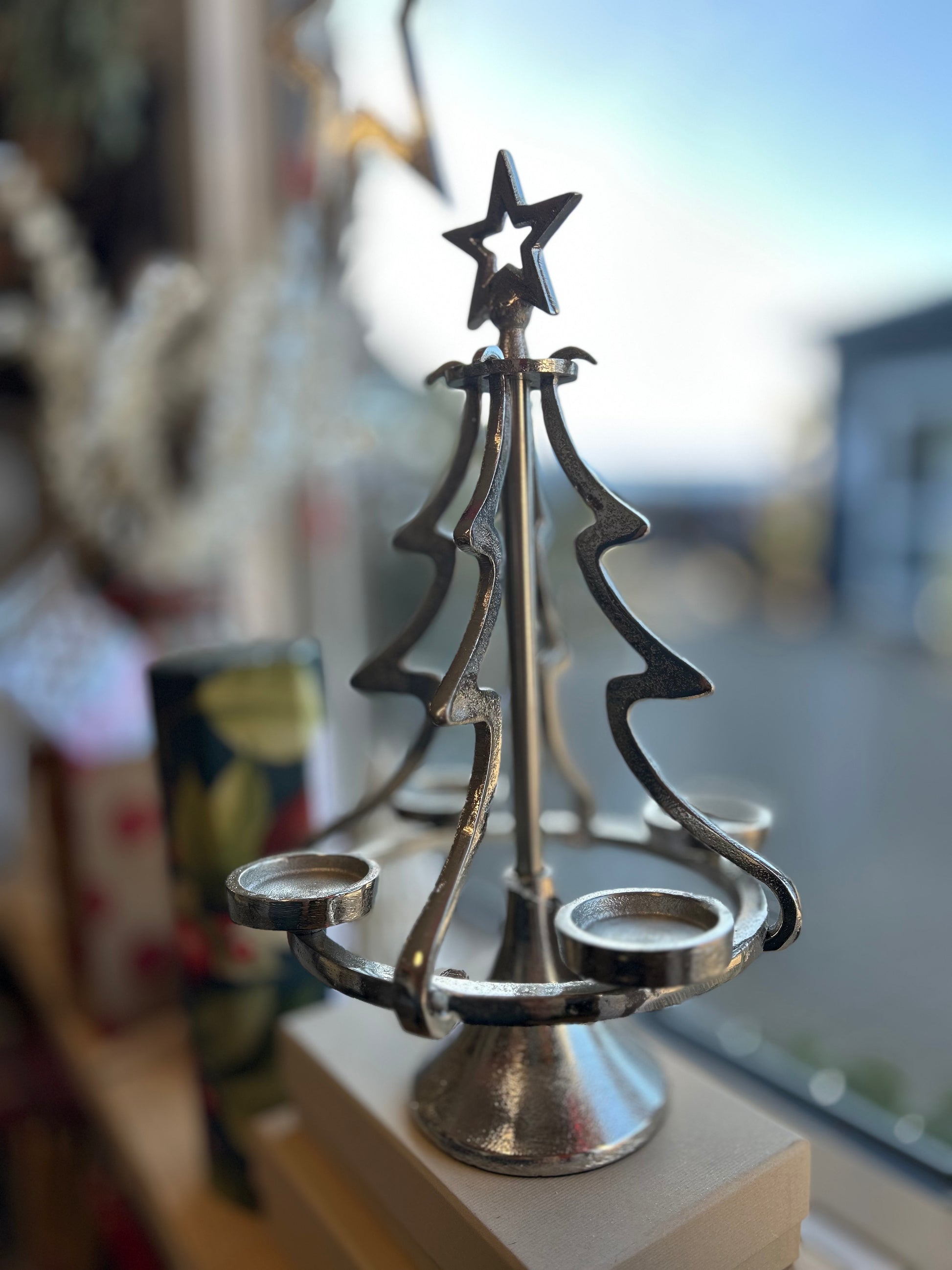 Enhance any dinner table or sideboard with this elegant tree T-light holder with a festive star on the top. The tree holds 4 T-lights in total, has a height of 26cm and 23cm wide.